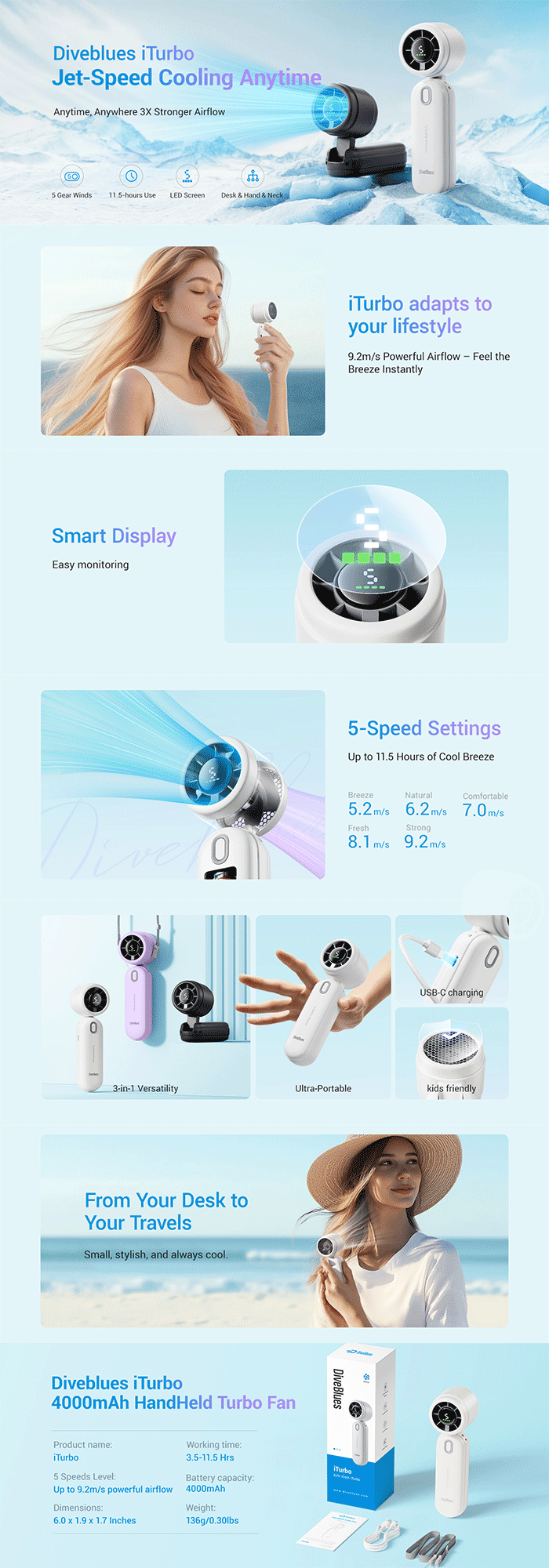 Handheld, hands-free, lanyard, or desk fan. Perfect for travel, outdoor adventures, and everyday use.Whether you need a gentle breeze or a strong wind, you can find the perfect cooling level to meet your needs. Its modern, ergonomic design provides a comfortable grip and a stylish look, fitting any lifestyle. The coolest gift of the summer: a must-have for fashion, practicality, work, travel, and outdoor entertainment. This mini fan is popular with men, women, and children, making it the perfect summer gift.