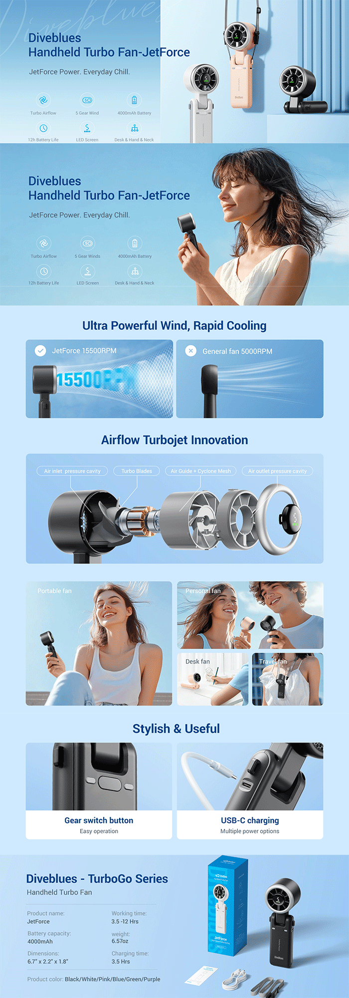 • Product description: Handheld, hands-free, lanyard, or desk fan. Perfect for travel, outdoor adventures, and everyday use.Whether you need a gentle breeze or a strong wind, you can find the perfect cooling level to meet your needs. Its modern, ergonomic design provides a comfortable grip and a stylish look, fitting any lifestyle. The coolest gift of the summer: a must-have for fashion, practicality, work, travel, and outdoor entertainment. This mini fan is popular with men, women, and children, making it the perfect summer gift.